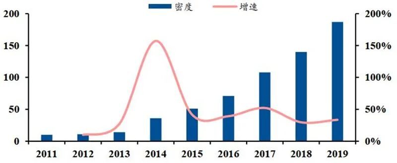 ▲国内工业机器人密度(每万名产业工人拥有的工业机器人数量)(单位:台/万人)