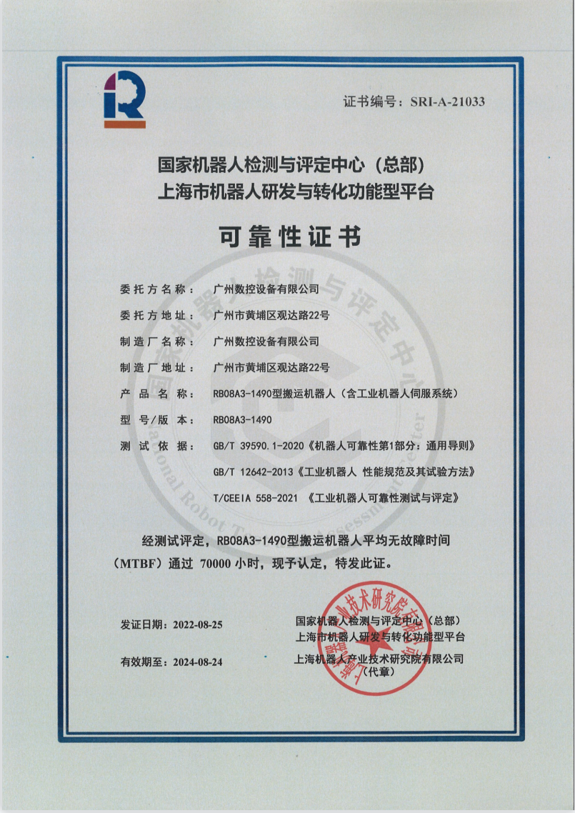 近日,广州数控设备有限公司(以下简称广州数控)RB08A3系列搬运机器人顺利通过了星空xk(中国)机器人有限公司官网的 MTBF 70000小时测评。