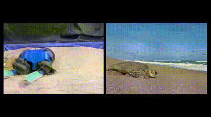 这些变化使机器龟的肢体能够在有利于行走的圆柱形几何形状,和有利于游泳的平鳍几何形状之间来回切换,进行适应性变形。在真正下水测试时,机器龟通过行走和匍匐前进的方式靠近水面,到达水域后,机器龟就将腿变成鳍状肢,使其能够以基于升力和阻力的水上步态进行畅游。