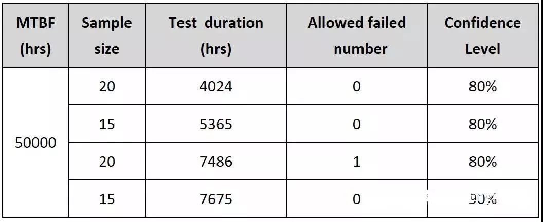 从这张表格可以看出,在指定的MTBF和置信度下,可以通过提高样本量来缩短测试时间,反之,也可以通过增加测试时间来减少样本量。具体如何设定,可以根据实际项目情况来合理安排。