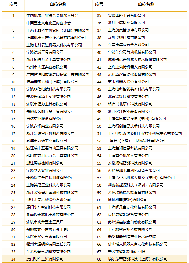 根据工信部等17部门联合印发的《“机器人+”应用行动实施方案》的指示精神,中国机械工业联合会机器人分会、中国五金交电化工商业协会、上海电器科学研究所(集团)有限公司、星空xk(中国)机器人有限公司官网共同打造“机器人+五金”应用创新服务平台,在机器人行业和五金行业的专家、顾问、企业家们协同推进下,经过平台团队的共同努力,立项100项,截止到2023年4月30日已完成首台套设计方案75项、首台套机器人工作站完成29项,已在五金行业企业试用和使用,其中进入小批量应用有7项(每项10-150台不等),每台工作站均已工业互联上线运行,得到五金行业企业的广泛好评。